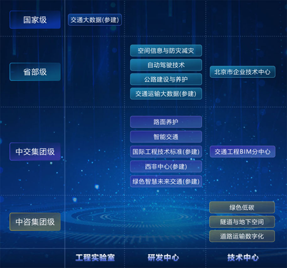 中咨集團(tuán)一直秉承“追求卓越、敢為人先”的創(chuàng)新精神,深入實(shí)施創(chuàng)新驅(qū)動(dòng)發(fā)展戰(zhàn)略,積極開展交通強(qiáng)國試點(diǎn)任務(wù)、科改示范行動(dòng)。承建了空間信息應(yīng)用、智能交通、智慧養(yǎng)護(hù)方向的交通運(yùn)輸部行業(yè)研發(fā)中心,6個(gè)中交集團(tuán)研發(fā)中心,自主成立3個(gè)中咨級專業(yè)技術(shù)中心,打造“四級三類”科技創(chuàng)新平臺體系。致力于成為中咨科技戰(zhàn)略的謀劃者、技術(shù)路線的設(shè)計(jì)者、技術(shù)開發(fā)的組織者和市場開拓的助力者,賦能公司九元業(yè)務(wù)板塊。